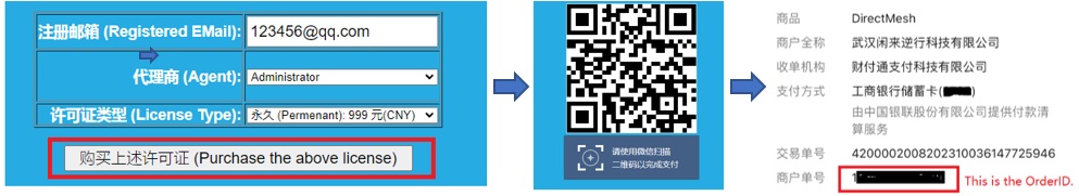 Executing this command opens the purchase page. You can also directly go to the license purchase page: License Purchase Link. Then follow these steps to purchase a license: First select the license type and fill in the information, then click the "Purchase the above license" button; confirm the order information and use WeChat to scan the QR code in the image to pay the bill; then find the order number in the WeChat payment information, the order number is the license; finally use the DAuthorize command to authorize your computer.