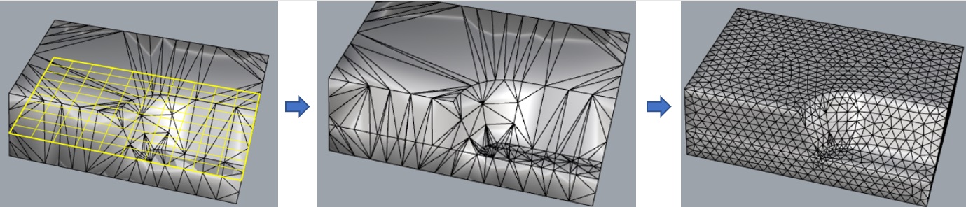 3. Use the MeshPlane command to draw a mesh plane, use the DMerge command to merge all meshes (MeshType=Joined), then use the DRemesh command for remeshing.