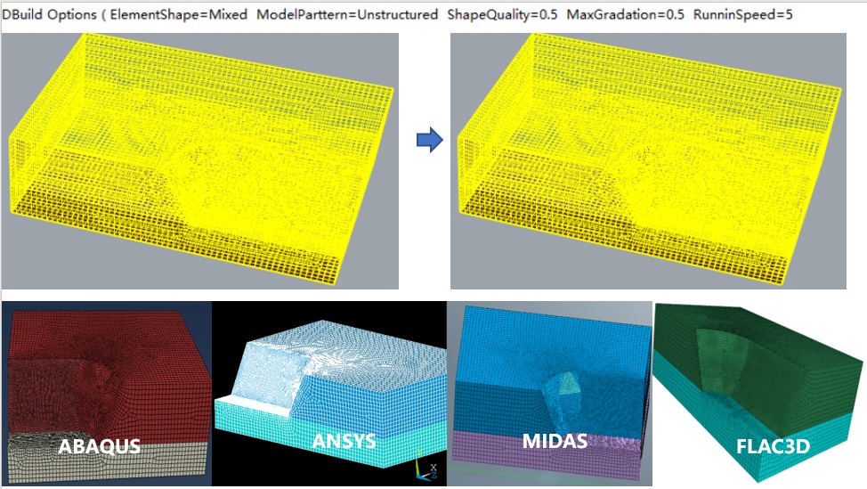 7. Use the Build command to build the finite element model and open it in finite element software (related model files are: DExample1.inp, DExample1.mac, DExample1.fpn, DExample1.f3grid and DExample1.fpn).