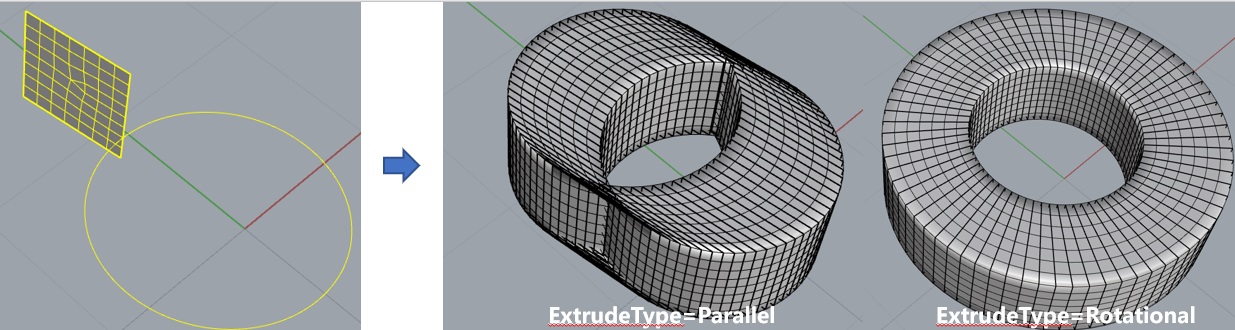 ExtrudeType - Extrusion mode. If ExtrudeType = Parallel, the mesh translates along the curve. If ExtrudeType = Rotational, the mesh translates and rotates along the curve;